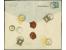 15 Soldi blau, 4 Einzelwerte, zusammen mit 5 Soldi rot und rückseitig geklebt 10 Soldi braun, mit EKr. "PADOVA 23/5", auf großformatiger eingeschriebener Briefhülle mit nebengesetztem kleinen roten L2...