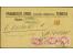 1908/10, Kreidepapier ½ Piaster, Viererblock und Einzelwert, mit DKr. "CAIFA7/5 09" auf kompletter Paketkarte mit Coupon von "BURG BZ. MAGDEBURG 9.4.09" nach Beirut und nachgesandt nach Haifa.